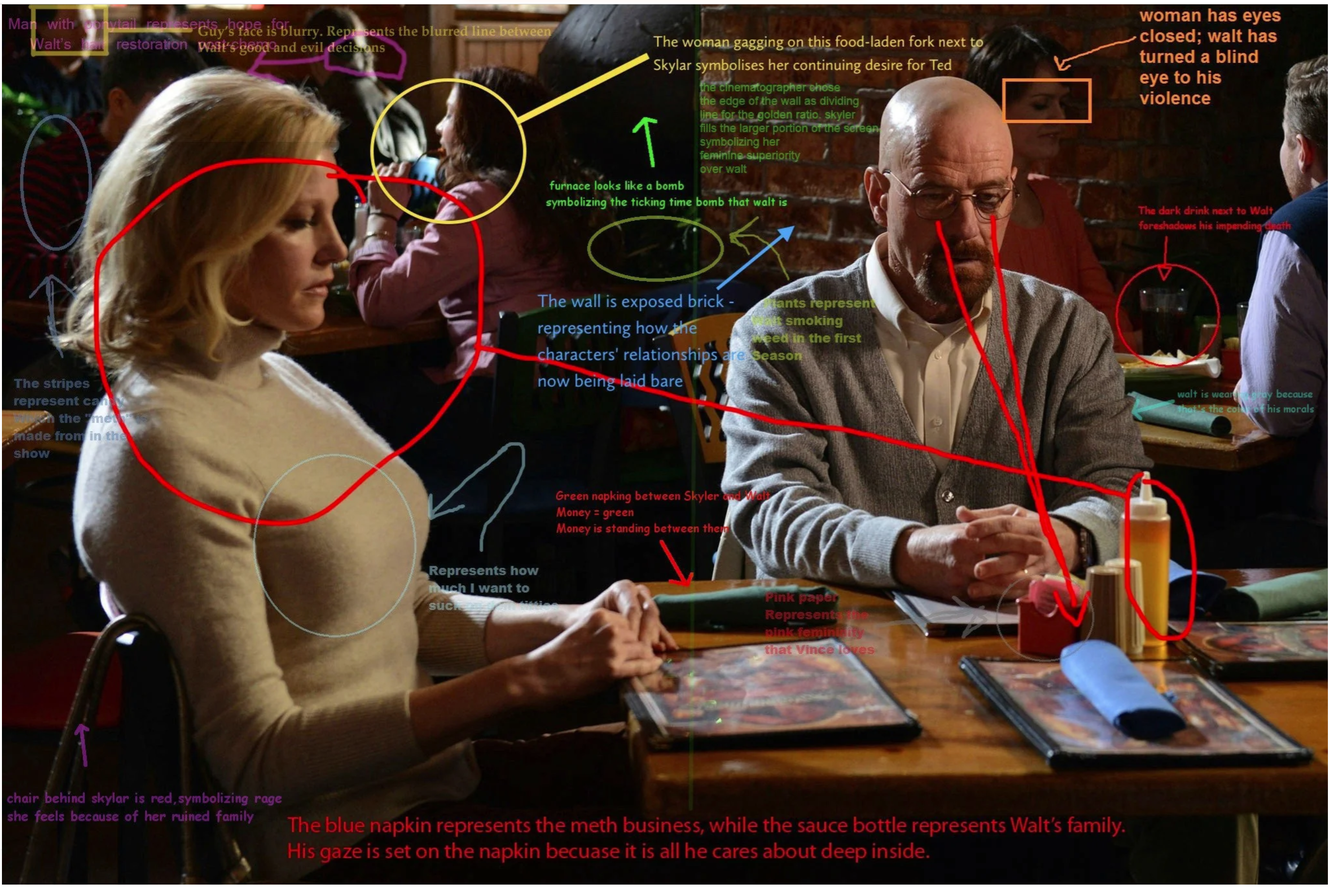 Отличная сцена. Джесси(быдло) называет картины О'Кифф "претензионными", а Джейн(интеллигент) пытается ему объяснить, что это искусство. Ну потом-то Джесси стал "настоящим мужиком", перестал смотреть бабские сериалы и стал смотреть "Ландман" и "Йеллоустоун" Рёфна. И перестал быть быдлом, наконец-то понял смысл картины с дверью.