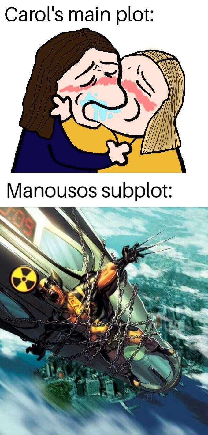 Манусос как всегда едет. Ждём в следующей серии панчлайн о том, что он на самом деле гомофоб и будет презирать Кэрол из Турки не за то что якшается с Ними, но за свою любовь к рыбе.