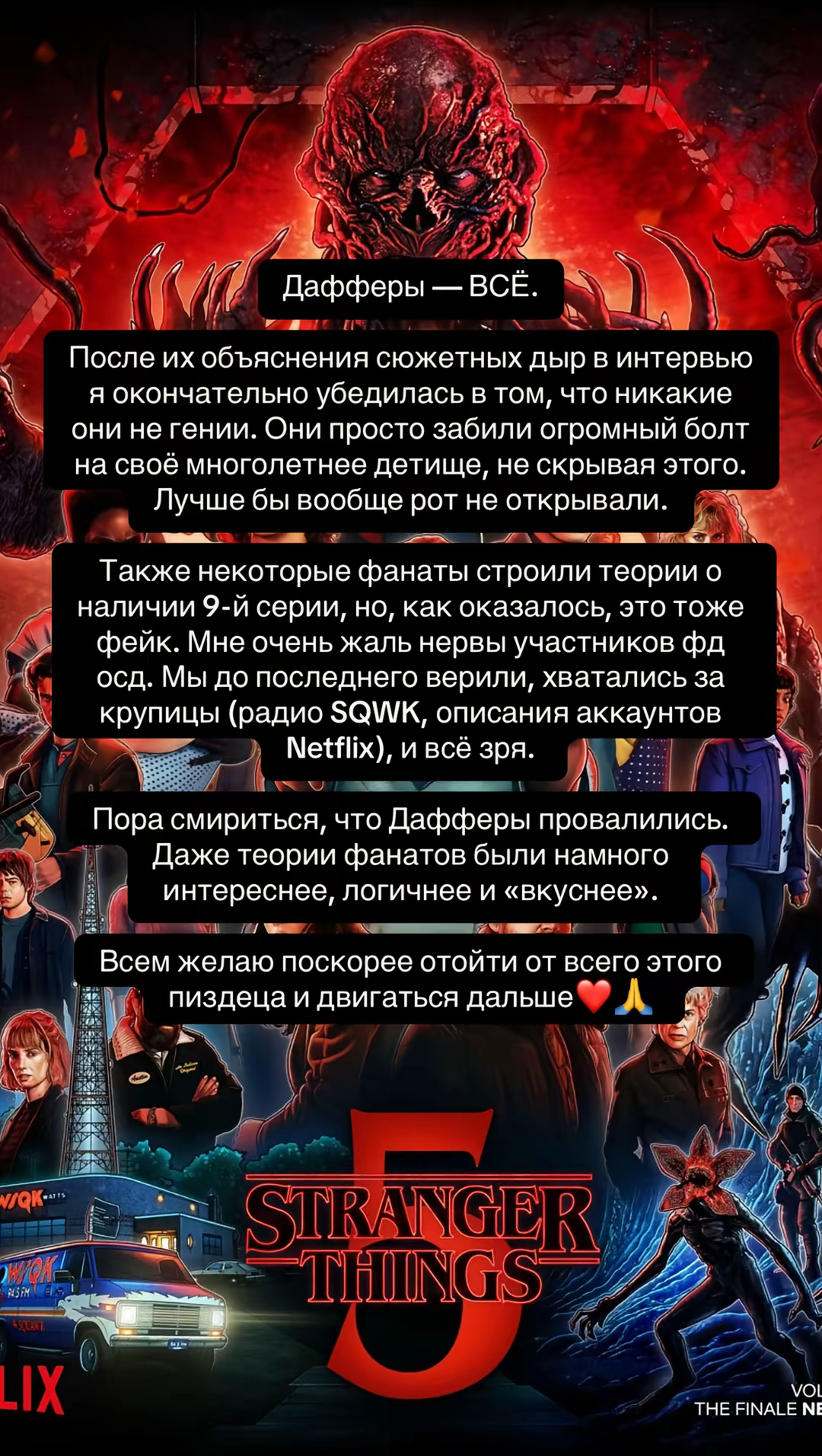 Пятый сезон на тройку. Схлопывание изнанки эпичное, эпилог хороший. А вот битва с паукообразной ебаниной, которую векна наростил из пожирателя, хуита. Разборки персонажей доебали. Сюжетные дыры - рукалицо. Либо реально порезали монтаж, либо сценаристы дебилы (а там не одни Дафферы этим занимались если что).