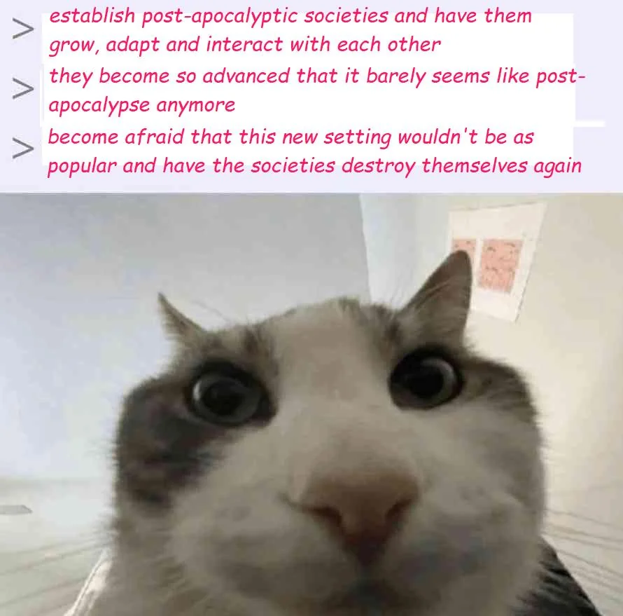 >>3470586 Просто я не могу понять логику "нужен постап любой ценой через 200 лет после ядерной войны" и "давайте разъебём все фракции, нужна анархия, постап, мазафака!"
