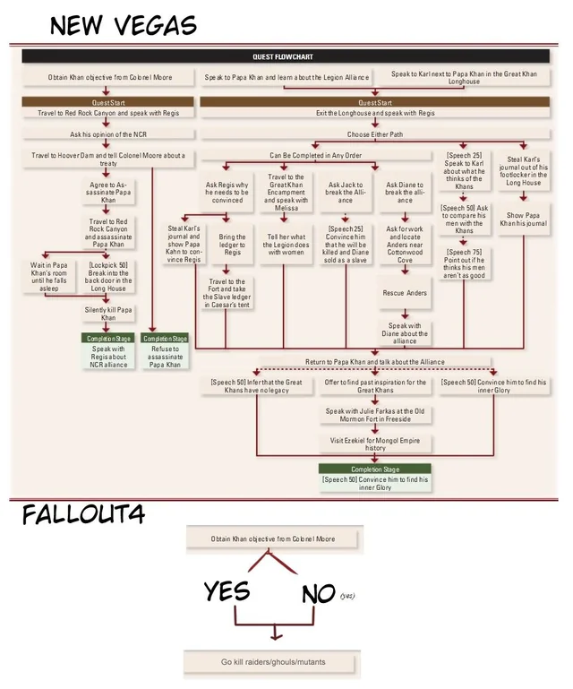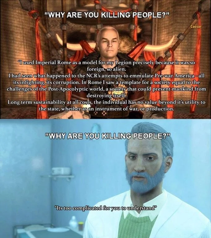 Но Тодик Говард поступает по своему: разьебали НКР ядерной бомбой, причем её не сбросили и не отправили ракетой, а просто провезли в телеге, легион цезаря за 20 лет после смерти цезаря все еще хуярится друг с другом, типа за столько лет междоусобиц он еще не развалился и в нем не нашлось сильной личности которая перехуярила бы конкурентов? Да ладно. Ну и БС конечно же превратили в ксенофобных патриотов которые мечтают возродить порядок на пустошах, блять.