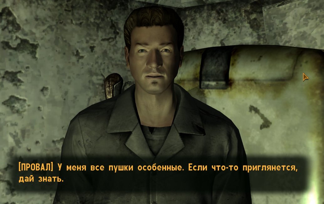 >>3471191 >>3471206 Увидел вчера эту картинку второй раз в обсуждениях на другом форуме, и решил проверить, что там за "ужасный" диалог В общем. Подходишь к торговцу оружием и спрашиваешь, есть ли у него на продажу что-то особенное. Он спрашивает, работаешь ли ты на казино. Для убедительного ответа нужно 30 убеждения. Ответ всегда один - "нет", но результат разный. Если чел посчитает, что тебе можно доверять, то предложит на продажу дополнительные пушки. Если убеждения не хватит, то он предложит свой обычный ассортимент Навык спича тут просто определяет, как надежно выглядит ГГ, а не то, что типа "ыыы а чо для отвата из трех букв нужно навык качать ыыы"