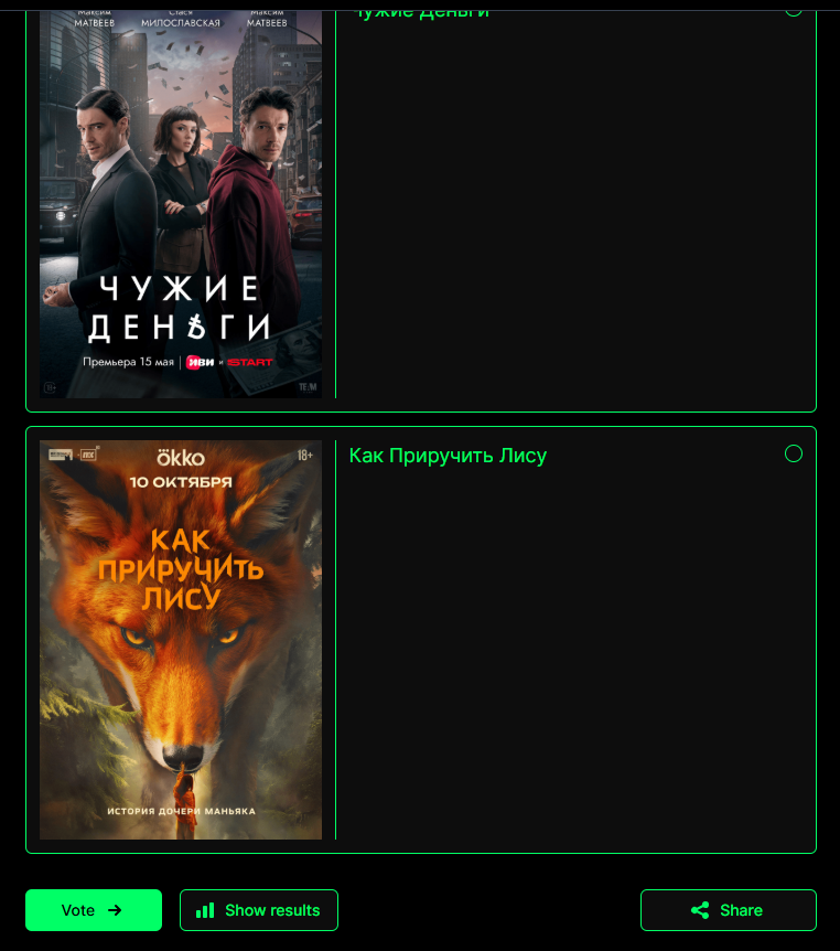 >>3473060 Э, чмоня, а почему там второго сезона Кибердеревни нету. Пришлось за Дашеньку голосовать... Но, если честно, он мне больше Гостьи понравился.