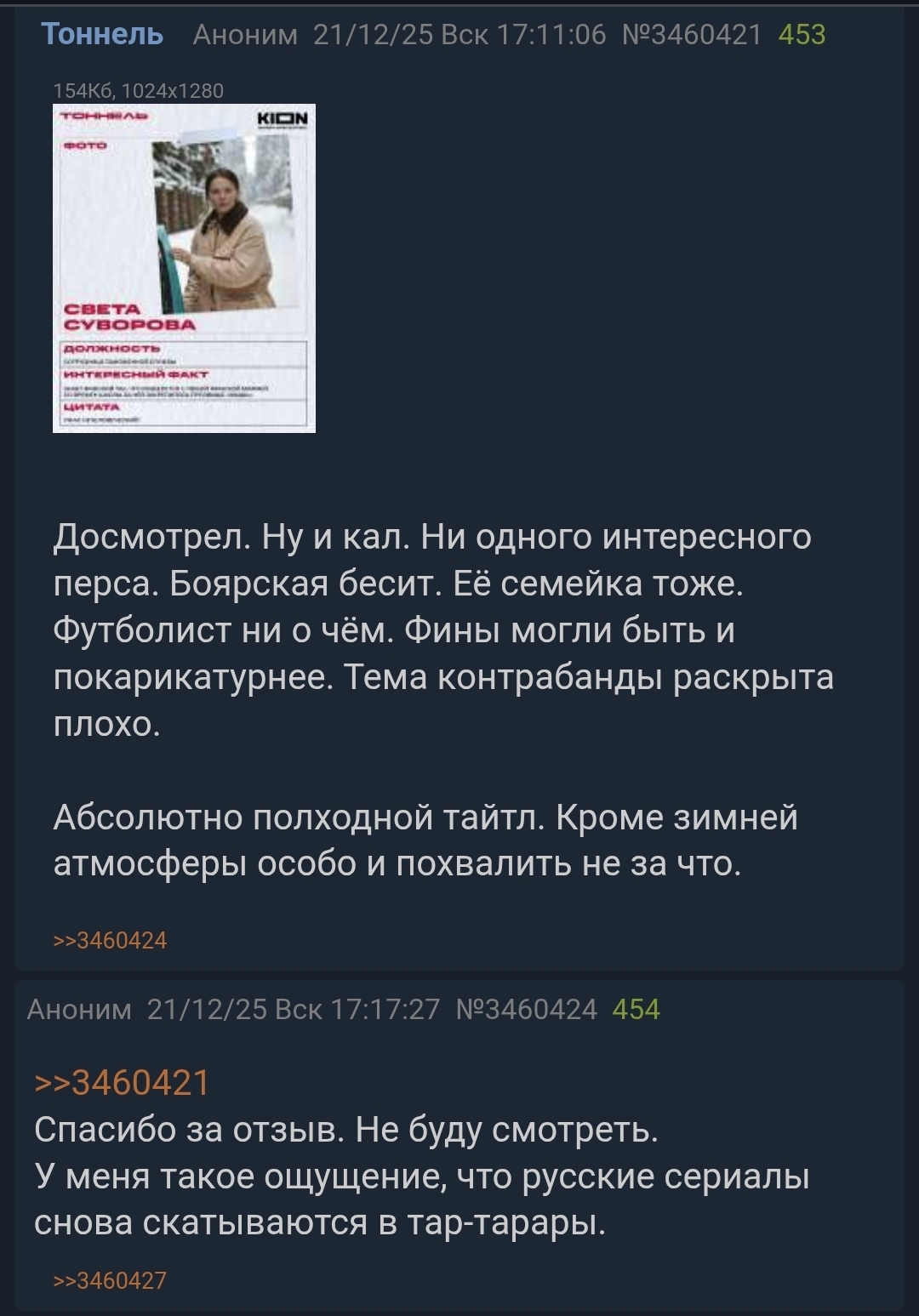 Досмотрел Тоннель. Боярская неожиданно норм зашла, хороша сучка, и в моментах пиздеца, и когда изображала уверенность. Не понимаю, почему тут её хейтят. Финский рэп русского производства качает. Русские актёры, которые играли финнов, похожи на финнов, их игра была неплоха. Гилёв хорошо сыграл тряпку. Калинина бесила своим уёбищным голосом так же, как в сериале про лису. Страхов бесил, играл какого-то пиздлявого мента, было слишком потужно с его стороны. Актёр, который играл Ухова, ещё с Противостояния убедил, что ему только и играть злых поехавших персонажей с таким-то ебальником. Рад, что в конце был своего рода хэппи энд в том плане, что русские, в конце концов, всех переиграли. Но и биттерсвит моменты тоже были. Короче, сериал оказался лучше, чем я думал. 7/10.