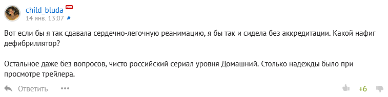 Её заслали в ординатуру, которая находится в Заполярске. Там, как вы понимаете, не очень тепло, не очень много инструментов и не самые ответственные доктора. То есть заход такой базовый-базовый. Интрига в первых сериах тоже классическая – надо довезти донорские органы в лютую метель. Исход был очевиден заранее.