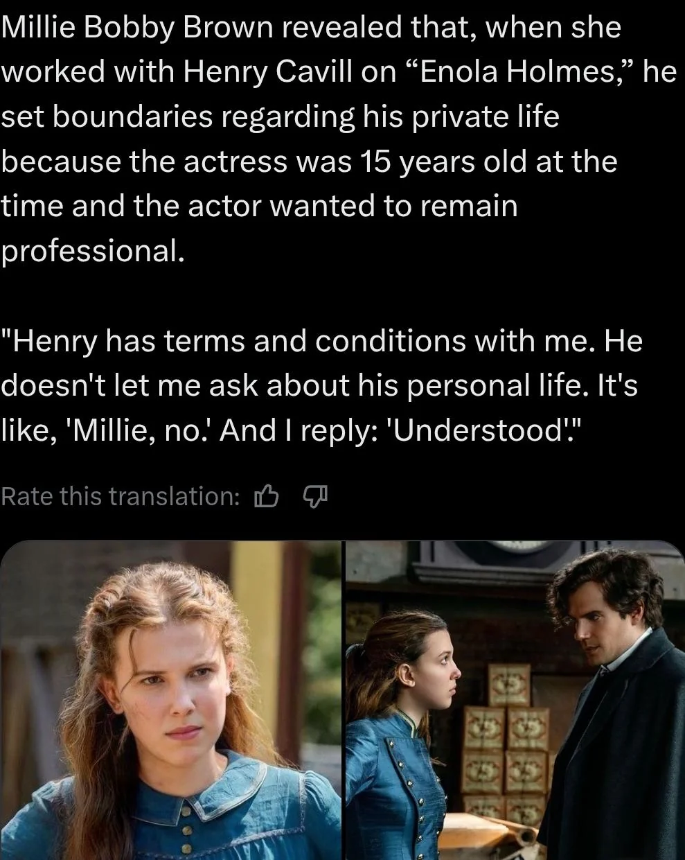 Милли Бобби Бонни Браун-Бонжови рассказала, что Генри Кавилл боится людей во время работы над первой частью "Энолы Холмс" вместе с Генри Кавиллом, тот установил границы касательно его личной жизни, поскольку актрисе тогда было 15 лет и Кавилл хотел, чтобы всё было профессионально.