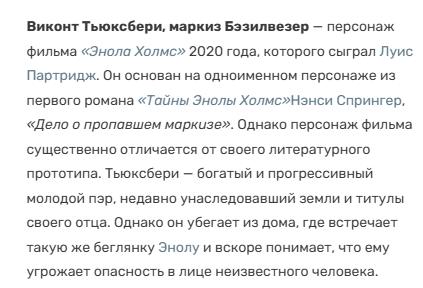 >>3506378 Он рассказывал, что вообще старался поскорее съебнуть со съёмок Энолы Холмс и не взаимодействовать с Милличкой во избежание скандалов, ведь она та ещё феминистка-скандалистка. Трули сигма, прогнул Бубби, поэтому Шерлок и получил нормальную сюжетну линию во втором фильме вместо декорации в первом. В третьем кста будет сцена с еблей с маркизом. Бонаква затерпит