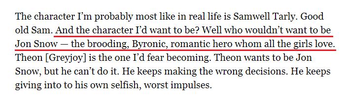 >>3482935 → >Зато он хотяб не копченый как с твоего жирушьего арта Дооо охуенно. Он буквально чернявая кудрявая кареглазая залупа там лол. И не надо про его род из британской аристократии, мы же про внешний вид, а не про то что он из достопочтенного рода рептилоидов. Ладно, мне тот арт тоже не нравится, я его скинул только из-за недовольного ебала. Вот более подходящие, уж сколько раз их итт кидал, наверно заебать успел анонов, кто помнит. Второй пикрил кстати у Мартыни в доме висит на стене. Цитата с четвертого пикрила тоже Мартыни. >Пока был книжный первоисточник - все события с обоими Джонами совпадали одинаково Лол нет. Например зарезали его потому что он одичалых пропустил, а не потому что собрался сестру у Рамси отбирать(т.е. прямо дезертировал). Не припомню чтобы в сериале он угрожал сыну Гилли сожжением. Не припомню чтобы он там посылал сира Алиссера в суисайд мишн. Джон - мрачноватый(мрачноватый, а не с лицом будто сейчас заплачет блять; выражение ебала должно Стаса напоминать, а не пятилетнюю девочку) и чутка завистливый юноша с амбициями, лидерскими качествами и черным чувством юмора, а не паладин.