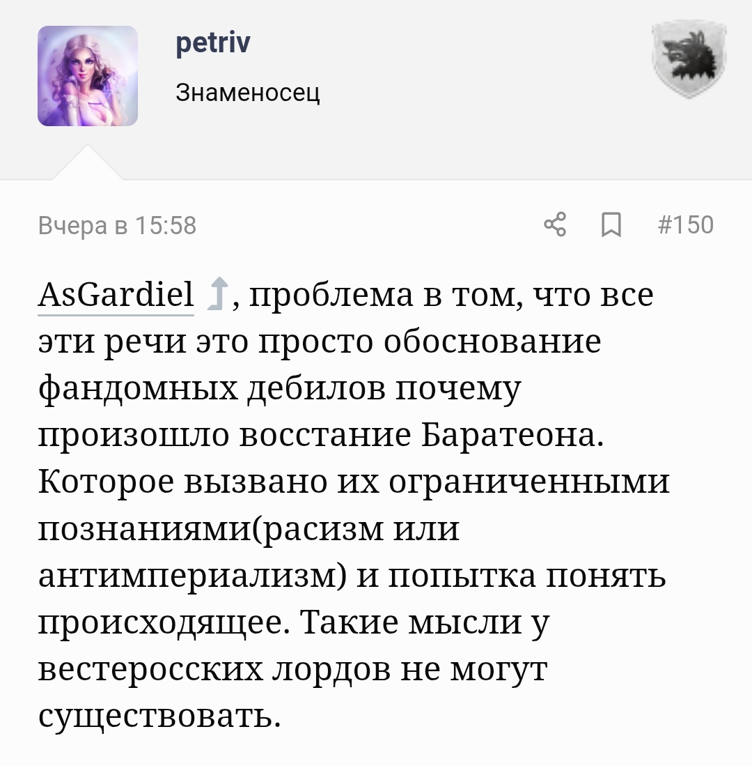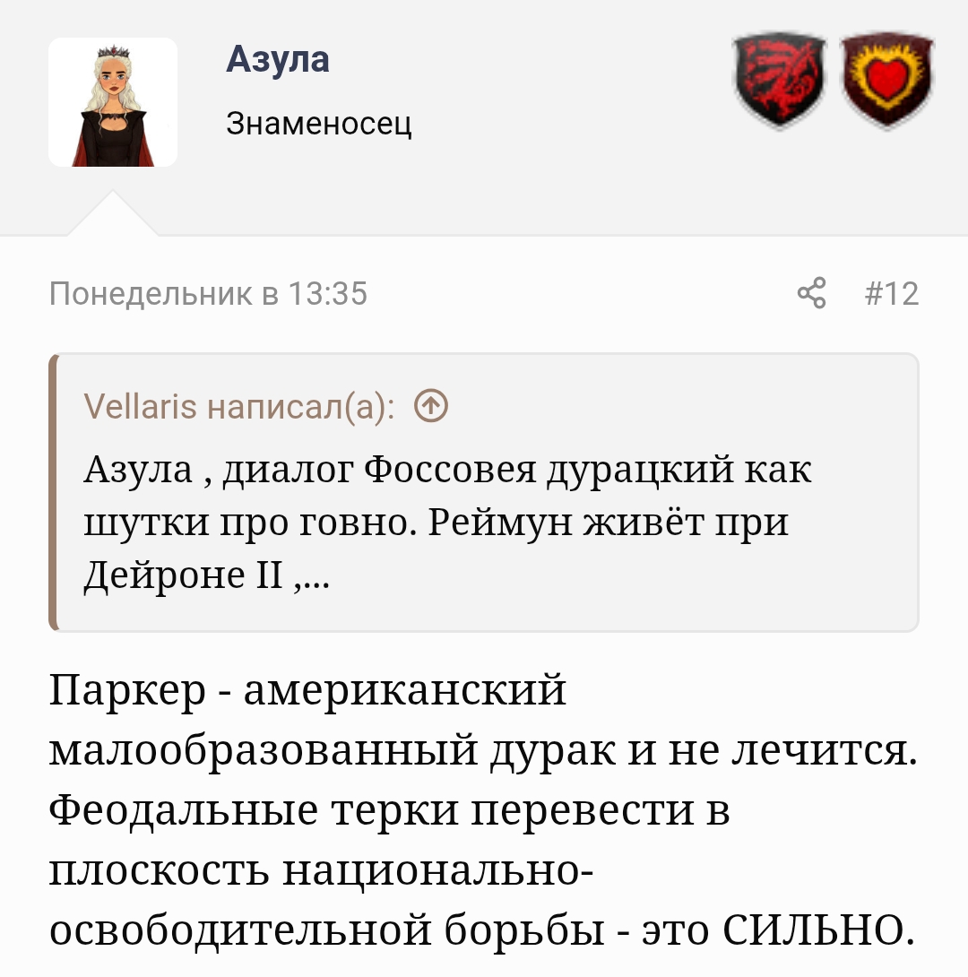 >Я всё больше убеждаюсь, что сир Раймун - провокатор Кроворона. Вся эта речь про "тиранов-кровосмесителей-кровавых магов" настолько вымученная и неестественная, что её иначе как в рамках провокации произнести нельзя. Ну либо сказочный идиот.