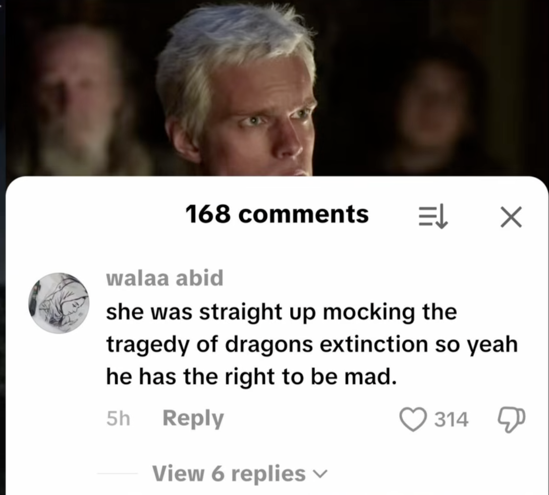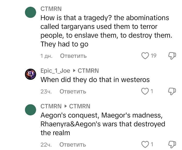 Ну а так там обе стороны говно. Я книг не читал, но слышал в треде говорили что Хайтауэры причастны к гибели многих драконов до событий, если так, то они самое говно, хуже червя.