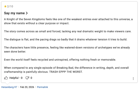 Суть в том, что недавно вышла пятая серия «Рыцаря Семи королевств», которую очень хорошо встретили зрители, и её рейтинг на IMDb приближался к «десятке». Некоторые фанаты «Во все тяжкие» решили устроить ревью-бомбинг и занизить оценку спин-оффа «Игры престолов».