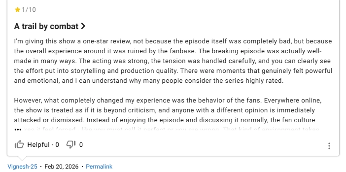 12 лет у эпизода была оценка 10 баллов из 10, но теперь она упала до 9,9 баллов — из-за «войны» с фанатами «Рыцаря Семи королевств».