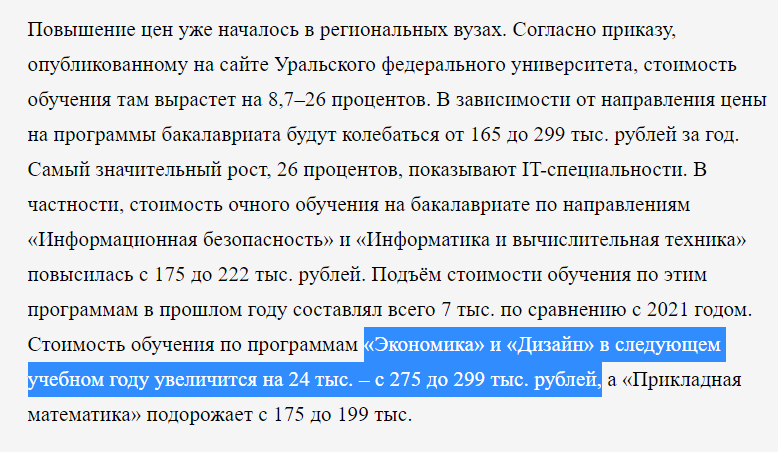 >>1003596 Вот тебе УрФУ, средневуз вполне себе, где экономика уже сейчас почти 300к в год стоит и за год на 24к поднялась в цене.