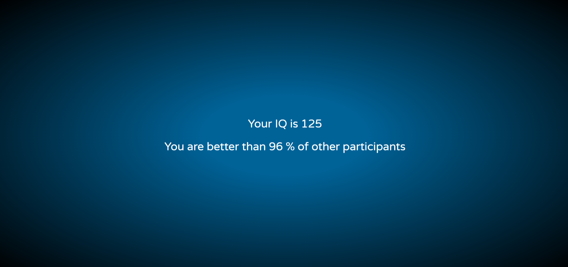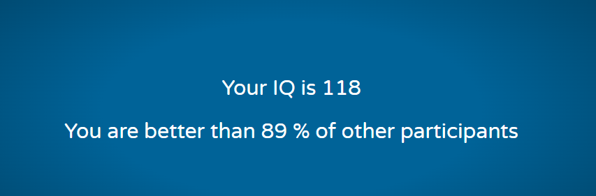 Я забайтился. Лёгкие 118. Но у меня большие проблемы в личной жизни, отчисляют с универа, да и в целом чувствую себя паршиво. Так что любая здоровая голова лучше какого бы то ни было невъебенного айку. Ещё эмоциональный интеллект > рациональный интеллект. А понимание, чего ты хочешь от жизни, вообще выше всего этого. Да-да, набрал чуть больше среднего, а уже мудрости раздаю. Тщеславие - мой любимый из грехов.