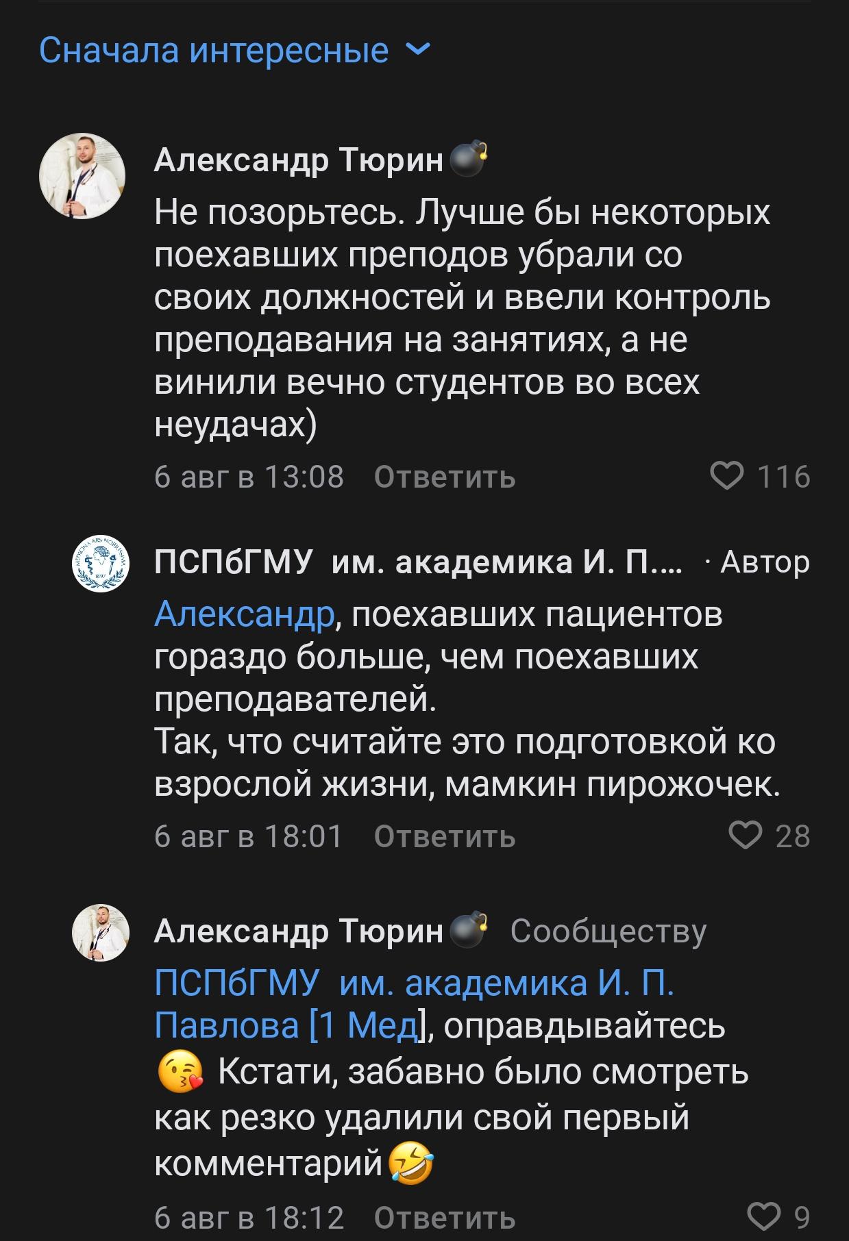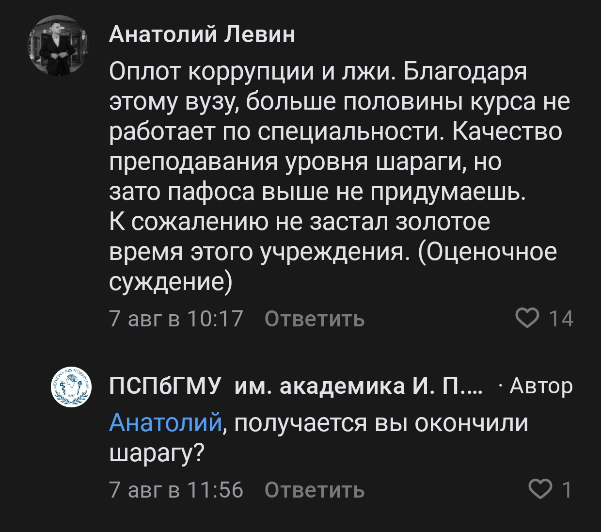 >>1059470 >топ вуза поехал-сеченовка и мгу. В голос, чел. Первая — понты понтами подгоняют, второе — место для будущих научных сотрудников и вообще больше междусобойчик. Топ это попасть в ординатуру в нормальной больнице с личным наставником. >>1059481 РосКуниМед кстати за вуз никогда не считали, высшая школа для фельдшеров погоняло было.