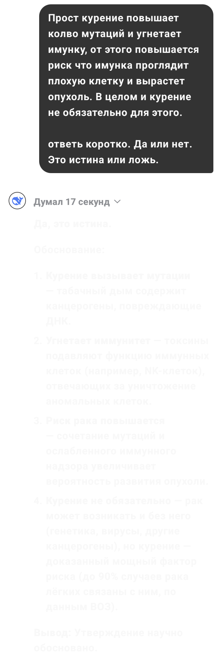 >Прост курение повышает колво мутаций и угнетает имунку, от этого повышается риск что имунка проглядит плохую клетку и вырастет опухоль Как мне эмпирически удостовериться, что есть: >мутаций >имунку >имунка проглядит плохую клетку >опухоль