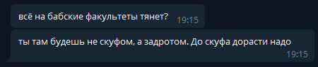 Очень больно обжёгся в 2023 году, я написал красивой девочке с беседы абитуриентов. Мне потом её быдлан писать начал ещё и тролил переиначивая мои сообщения.