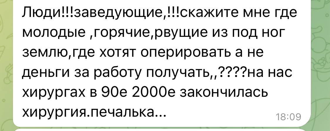 Всем привет. 5 курс, не определился куда идти. Часто думаю о любой хирургии, включая травму. Объясните, хирургия дно, ведь так? Я видел график дежурств большинства хирургов, обычно работают на 1.5, дома появляются редко. В частную практику уйти очень сложно. Чтобы научиться операциям, необходимо не спать, не работать, жить на волшебные деньги. Ничего не забыл? Уже не уверен что это то, чего я хочу. Начал задумываться о психиатрии/педиатрии.