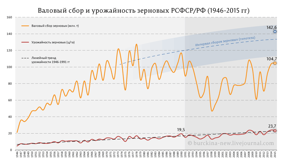 Россия/бСССР производит сейчас примерно столько же зерна, сколько производил Союз. Однако при СССР в обеспечении страны мясом делался упор на низкоэффективный КРС, который потреблял много зерна. Куры - идеальный источниик мяса, диетического, доступного, пригодного к промышленному производству - были на задворках. В девяностые рыночек порешал: по всей стране разрослись и укрупнились птицефабрики, курятина стала самым дешевым мясом, высвободились и пошли на экспорт излишки зерна.
