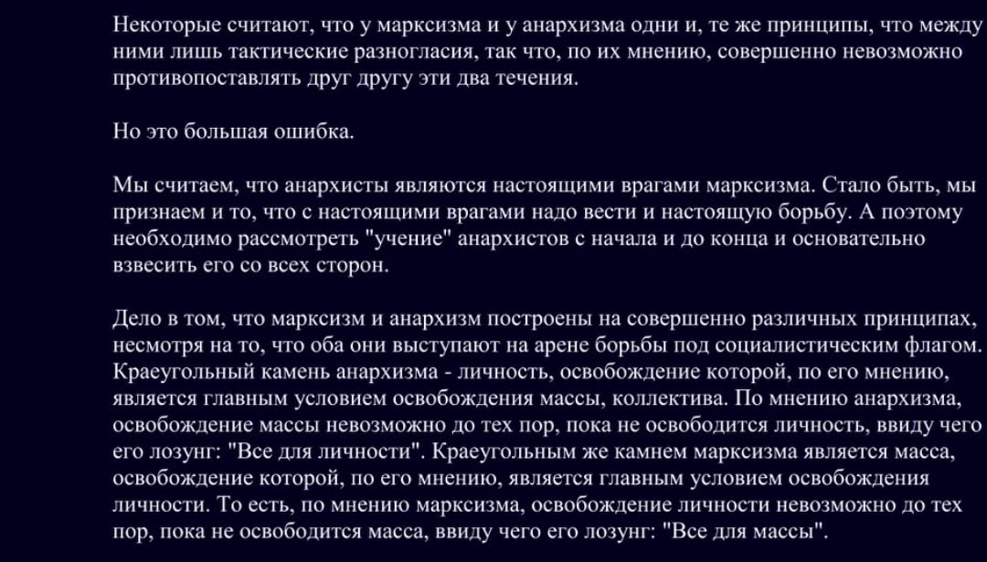 >>86427 У тебя написано ровно то, что я и сказал -- пути достижения общества социальной справедливости. Анархизм через ожидание того норота [через развитие индивида], марксисты через захват государства и создания условий для появления того самого норота. Цель одинаковая, а методы достижения прямо противоположны, что да, фактически делает маняхристов врагами маркчичтов. Как и соцдемопетухов, которые тоже за коммунизм, но через эволюцию капитализма, которой, по мнению марксистов, НЕ БУ ДЕТ.