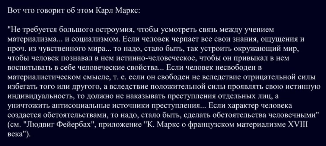 >>86421 >Я боюсь нам всем не к коммунистам Не бойся, только тебе. >Почему Потому что коммунистическая идея анархична, а тебе барин необходим, что прямо противоречит идеям коммунизма. Эт тебе к фашне надо. >я считаю что никто не знает что такое коммунизм Ну может ты не знаешь, а коммунисты знают. "На высшей фазе коммунистического общества, после того как исчезнет порабощающее человека подчинение его разделению труда; когда исчезнет вместе с этим противоположность умственного и физического труда; когда труд перестанет быть только средством для жизни, а станет сам первой потребностью жизни; когда вместе со всесторонним развитием индивидуумов вырастут и производительные силы и все источники общественного богатства польются полным потоком, — лишь тогда можно будет совершенно преодолеть узкий горизонт буржуазного права, и общество сможет написать на своём знамени: «Каждый по способностям, каждому — по потребностям»" >Ну вот не будет государства и анархисты просто так возьмут и будут жить нормально Не просто так, только создав условия для наступления анархиического общества. >А зачем вы тогда уточнили анархо-коммунизм? Подчеркнуть анархический фундамент коммунизма, не более. Вот собственно главное отличие марксистов от тех, кто себя называет анархо-коммунистами: "Анархо-коммунисты с марксистской концепцией двух фаз (социализма-->коммунизм) не согласны и считают, что для наступления полного коммунизма и ликвидации государства не нужна предварительная стадия усиления государства." >А угнетения нет без государства? Есть, но с этим пусть ебутся коммунисты будущего. У коммунистов настоящего главные задачи звуржения двух наиболее эксплуататорских и угнетающих социальных структур: а) Капиталистической системы б) Государства