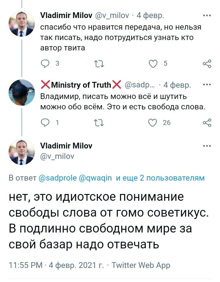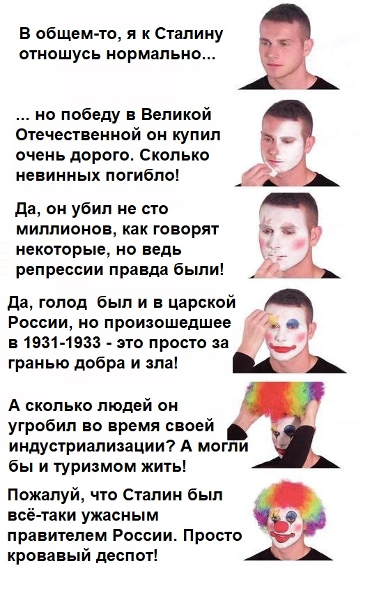 >>89330 >>89335 Советский человек так не рассуждает. Партия сказала, что у Сталина был ошибочный культ личности, значит культ личности. Раз объявила, что у Хрущёва случались перегибы и волюнтаризм, значит волюнтаризм. Брежнев пятижды Герой, – спасибо вам за ваш бессмертный подвиг, товарищ Генеральный Секретарь! Горбачев – ускорение и перестройка, ура товарищи!.. Ельцин – рыночные реформы, взяли под козырек. Путин-Медведев инновации и модернизации. За работу, товарищи!..