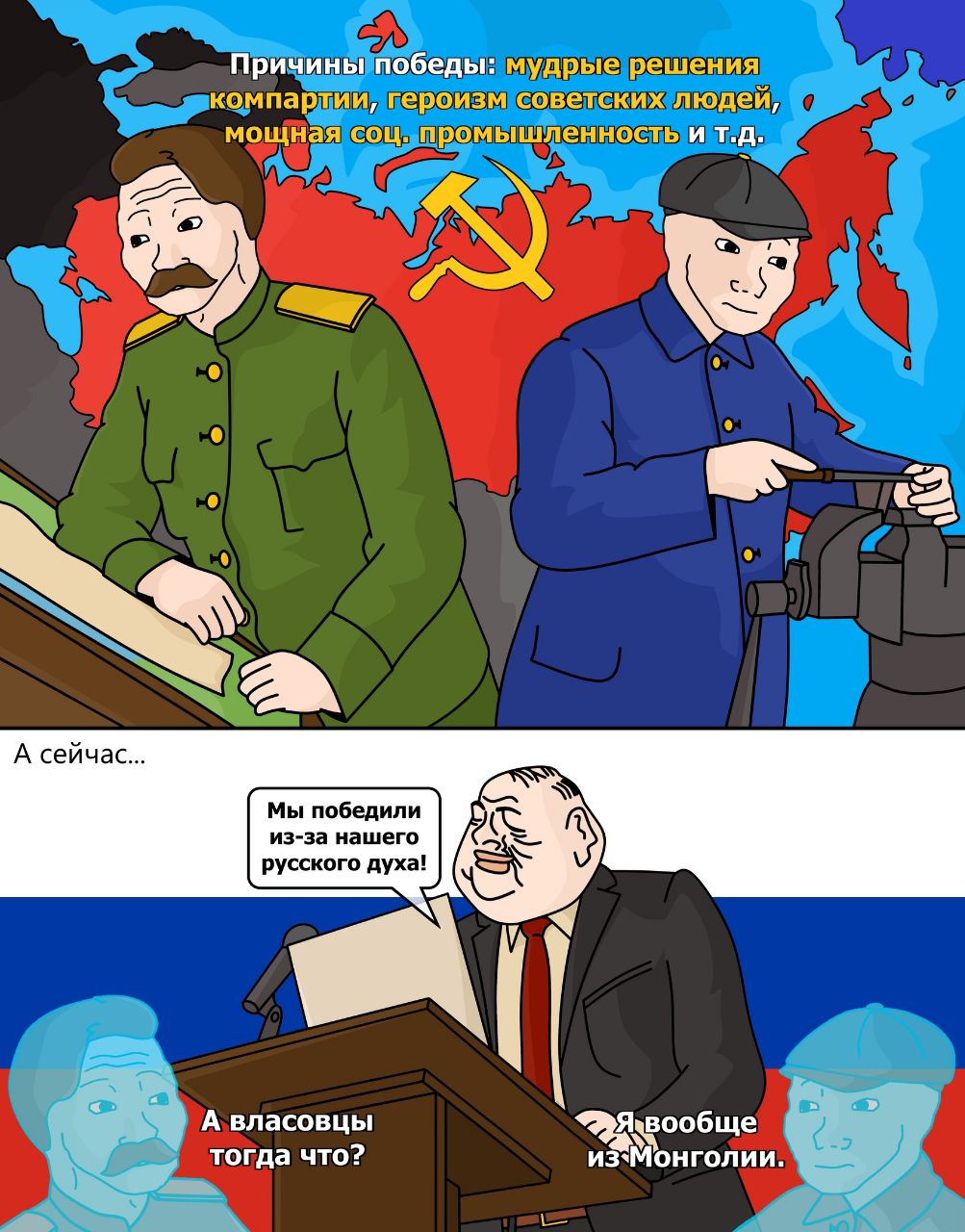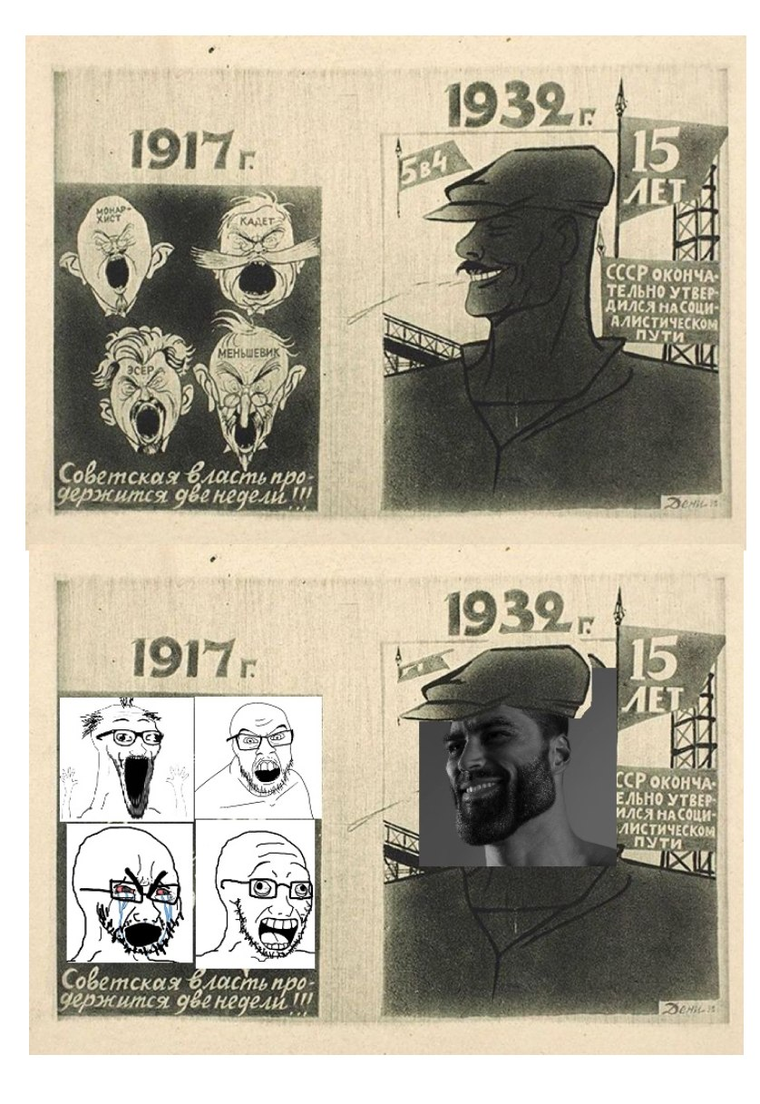 >>92382 Вот так большевики и подменили в головах немытого вчерашнего крестьянина бога, царя и отечество на родину и Сталина, и люди умирали не за идею, которую не понимали, а за Сталина. Умирать за личность умирать за Бога - это тоже умирать за личность самое раковое что можно придумать. Никто что-то не стремился переучивать крестьян кричать за коммунизм, вместо за Сталина, а что удобно. Само почти подменилось, даже на пропаганду тратиться много не пришлось. Только вот это выгодно в моменте, так и проиграли идеологическую и информационную войну с капиталистами даже не вступив в неё. Можно аппелировать к тому что информационную войну против немцев-то выиграли же... да ладно, что-то много вокруг лозунгов "пили бы баварское", как-то не тянет на победителя