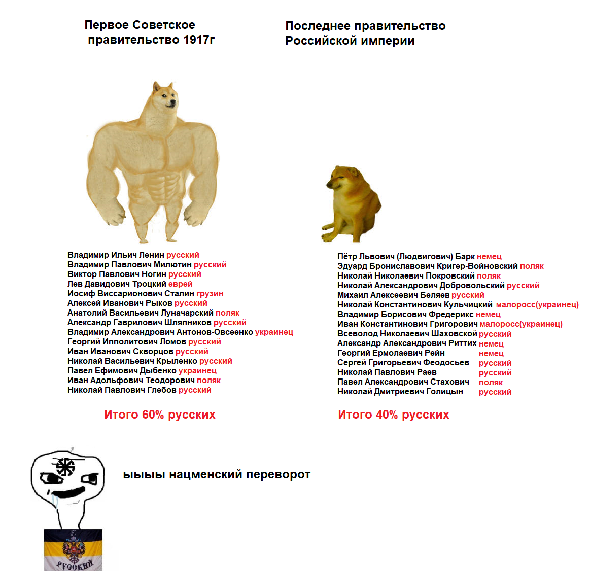 >>91647 >половина илитки даже по-русски не говорит >крепостное право было только для русских, пока поляки, прибалты, фины имели свои конституции >даже евреев крепостных не было >русских держали в дичайшей безграмотности и нищете, пробухивая бабки в парижах >ДА ПАЧИМУ РУСАФОБЫ!? Уебище, прекрати. >ленин уебок я пояснил - поддерживает врагов России. Единственный и главный враг России в 1917 году - это охуевшая от жиробесия, насилующая русский народ цареблядская илитка. Повторяю - пошел на хуй отсюда.