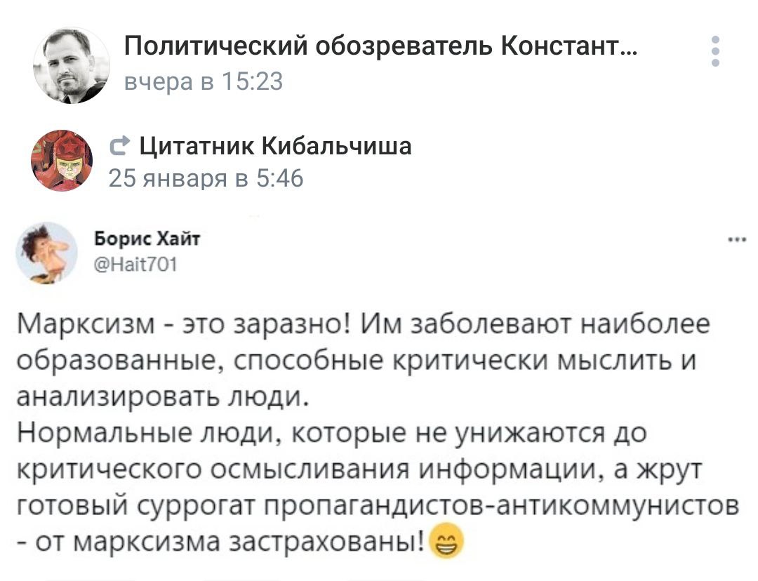 >>100994 >я считаю его объяснение истоков всех описываемых и критикуемых им явлений позорно волюнтаристским Ничего удивительного, борьба за власть же. >Рекомендую ознакомиться с циклом статей Сарабеева на LC и прекратить это позорное поясничание. Почитываю их статьи периодически, кстати. Некоторые сохраняю на комп. но в целом, настороженно к LC отношусь, как и ко всем остальным подобным ресурсам. >Перестать быть позорным троцкачом и стать нормальным марксистом. Что троцкисты, что сталинисты - зеркальная копия друг друга, а всё их отличие лишь в вайфу, от идей которых они точно так же далеки, как и от марксизма. Впрочем, я выше написала своё мнение о них на эстонском, да.