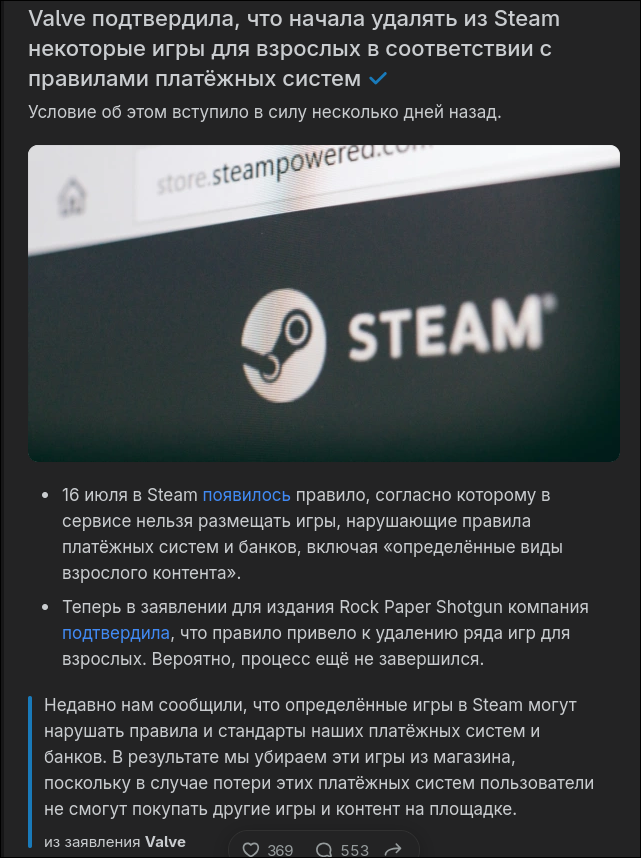 Вы там совсем уже отупели и обезумели от новостей разряда "ПОЧАЛОСЬ"? Funpay не так поняли закон, и обосрались. И решили нагнать во первых себе трафика, и во вторых испугать всех, если правильно трактовать данный закон на русский язык, то он не касается игр никоим образом. Работает он примерно так: Берём условного Петю, если он передает Ване аккаунт Маши без её согласия, то он получит - штраф Берём другой случай, и так же берём условного Ваню, который передает Антону аккаунт Саши, а Антон начал совершать с этого аккаунта преступления, то тут уже будет - уголовка. Берём уже третий случай, Вячеслав передает Анне свой аккаунт PSN для покупки игры, то у неё просто появятся новая или даже новые игры. Простым языком, данные поправки касаются исключительно преступников, и мошенической сферы. >>9688702 ВНкоговно начали недавно цензурить из-за открытого письма фемнисток, которые обратились к Paypal, Visa и прочим организациям которые обслуживают Steam, и Valve скорее всего прилетело из-за этого письма. В этом письме феминистки упомянули недавно нашумешвую игру "No Mercy", описав, что в данной игре можно изнасиловать членов своей семьи и не только (мать, сестра, тётя и тд), и они так же упомянули, что таких игр в Steam находится сотни, и они обратились с просьбой приостановить обслуживание данной платформы. https://www.collectiveshout.org/open-letter-to-payment-processors
