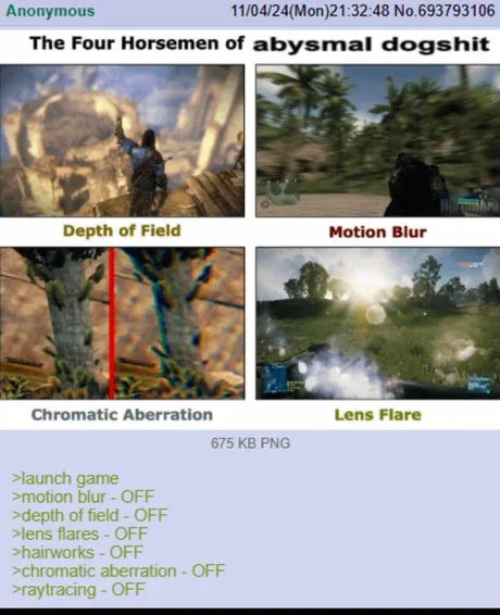 >>9694241 Всё выключаем, что снижает чёткость и разборчивость картинки. Я бы сюда добавил виньетты, которые затемняют картинку по краям. Уёбищный эффект, который ПРОСТО ТАК сужает поле зрения.