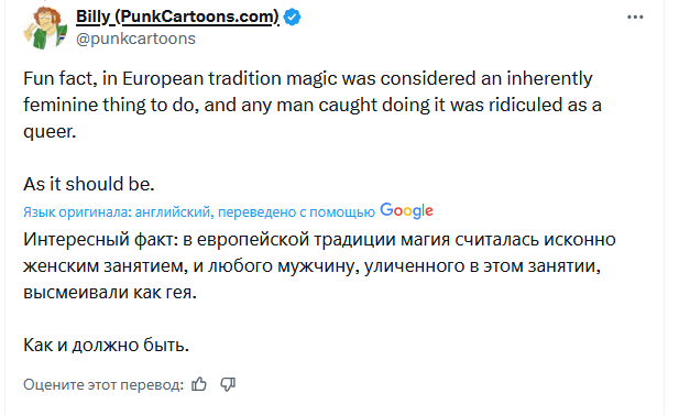 Вот тебе для справки: в средневековой Европе колдовство всегда связывали с женственностью и поэтому если какого-то мужчину подозревали в колдовстве, то это автоматически подразумевало что он пидор.