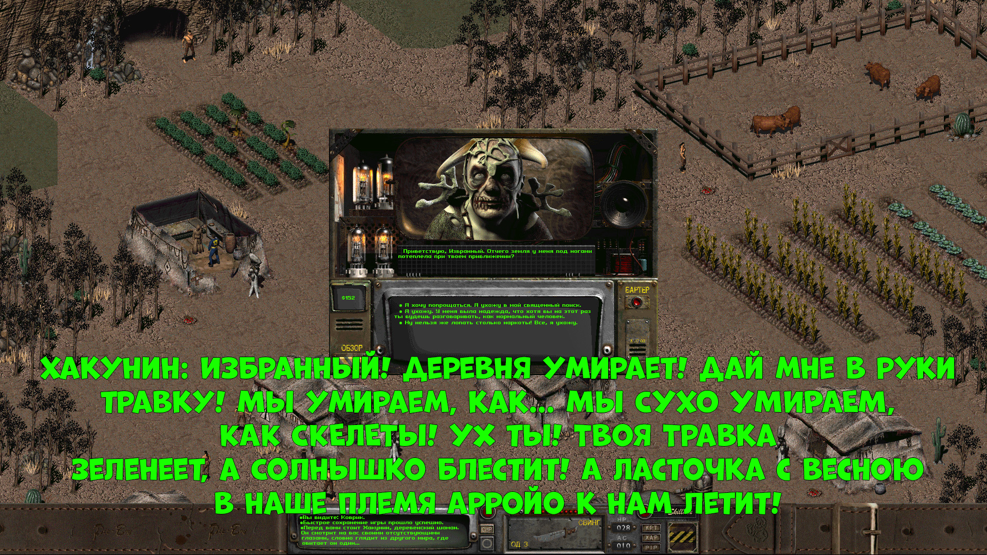 Мемный комикс про шамана деревни Арройо из Фоллаут 2: Хакунин: Избранный! Деревня умирает! Дай мне в руки травку! Мы умираем, как... МЫ СУХО УМИРАЕМ, КАК СКЕЛЕТЫ! Ух ты! Твоя Травка зеленеет, а Солнышко блестит! А Ласточка с весною В наше племя Арройо к нам летит!
