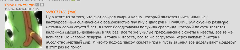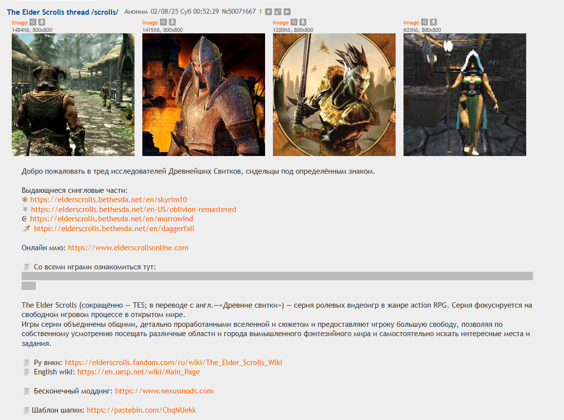 Он дохлый и секретный без притока. Даже итт скорость больше, чем в том разделе который доживаешь лишь благодоря тредам с моддингом. Вот недавно обливион вышел, весь хайп слился в никуда. А могли б сейчас возродить интерес к свиткам.
