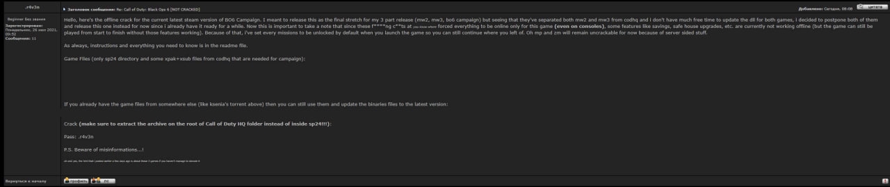 Качнул, поиграл полчаса, удалил. Ну и параша. Вместо сюжета очередной ДОПРОС С ВОСПОМИНАНИЯМИ, как в быдлофилде 3. Графон гиперублюдочный, мыльные текстуры, лоды хуже чем в киберпанке, субтитры пидорасит. Оружие пластиковые дилдаки как до MW 2019, с этого я вообще выпал. Отдельно проиграл с вертикальных цветных полос над дропнутым оружием в стиле бордерлендс, кек. И это после Cold War, который был хорош. Если хотите calodudi бесплатно без смс торрент, лучше поиграйте в MW2019, MWII и Black Ops Cold War, это реально достойные части и те самые аттракционы на 4-7 часов с пиу пиу и голливудской постановкой.
