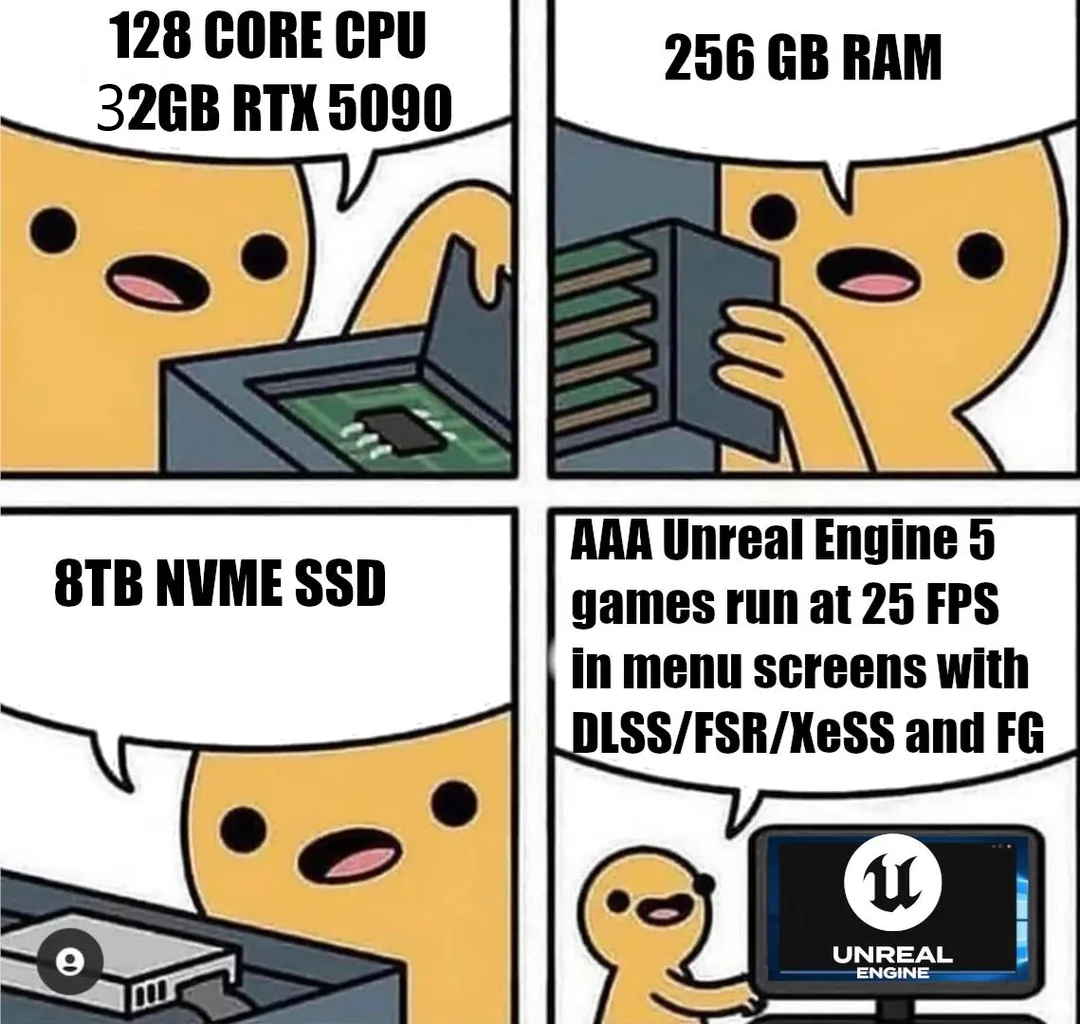 >>9715579 (OP) >GeForce RTX 5090, которая раньше выдавала около 48 FPS в 4K >большинство видеокарт ниже уровня 4080 попросту не справляются с текущей версией... ...в разрешении 4к. Не справятся в разрешении 4к. Под которое видеокарты ниже 4080 в принципе не рассчитаны. А в фулл-HD, без нанитов и ртх лучей справится даже затычка вроде гтх 1080.