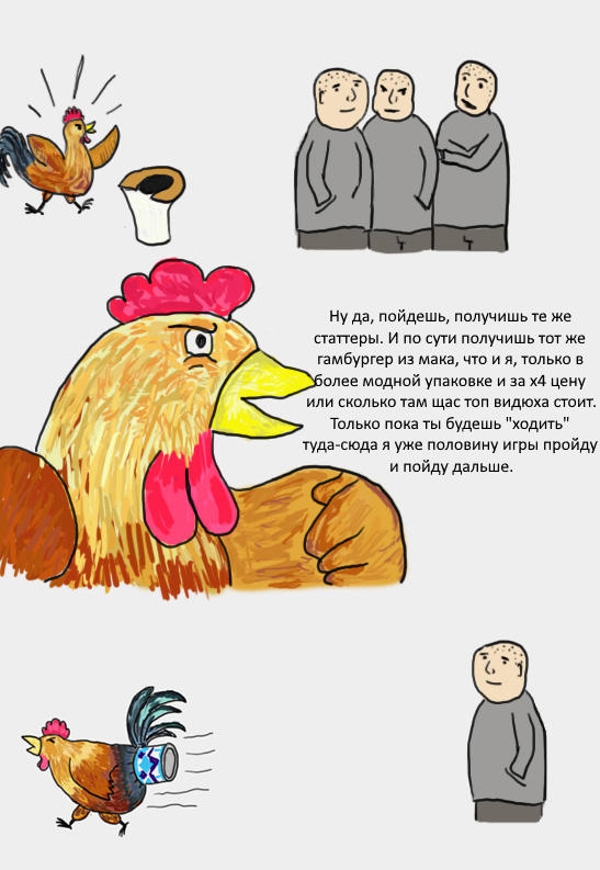 Итог: - Васян тщательно выбирал комплектуху, срался на форумах, отглядел 100 часов железных обзоров и тестов, рылся по днсам/аликам/ситилинкам/cu - насобирал себе пуку за 1500-2000 баксов - играет с лагами сидя в своем проперженом кресле, как школьник. Винит всех вокруг - разрабы плохо оптимизировали игру, железные делают железки из плохих материалов, другие железные пишут плохие драйвера, четвертые еще в чем-то виноваты. - Джонни купил на новый год плоечку, а новую игру купил на диске, пока покупал продукты в волмарте - играет без лагов сидя на диванчике.