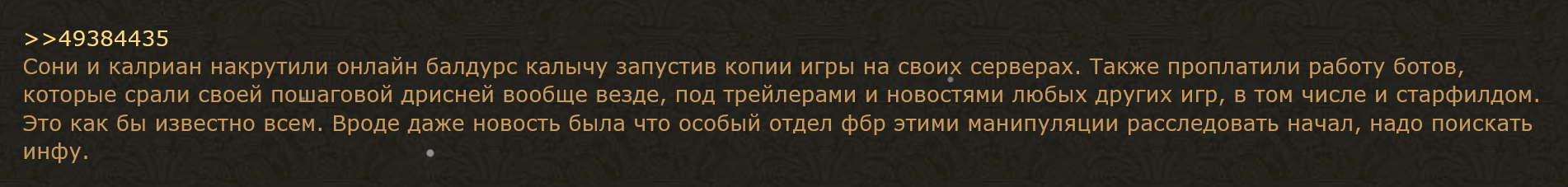 Лишний раз напомнило мне какой старфилд был пиздатый Собственный движок, не сиквел, уникальный сеттинг, никакого деи и сои, трушная большая игра беседки....