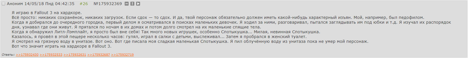 Моим первым персонажем, например, был педофил. Всякий раз, когда я достигал нового форпоста, первым делом я искал маленьких девочек. Я следовал за ними, разговаривал с ними, пытался заглянуть им под юбку и так далее. Я изучал их привычки и где они живут. Я прятался в их домах по ночам, чтобы посмотреть, как они спят.