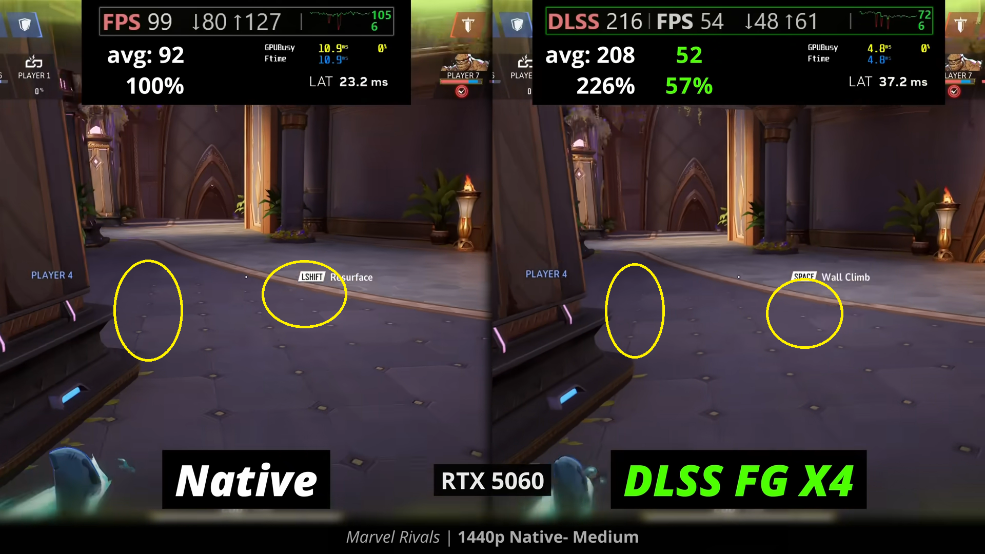 По теме. Самое кошмарное в FG, что оно жертвует огромным количеством реальных кадров ради генерации манякадров. Мой второй пик как пример. Слева - сколько кадров было до включения FG, справа - зеленым указано, сколько реальных кадров осталось после включения FG.
