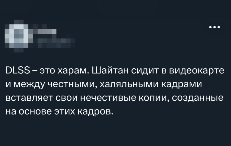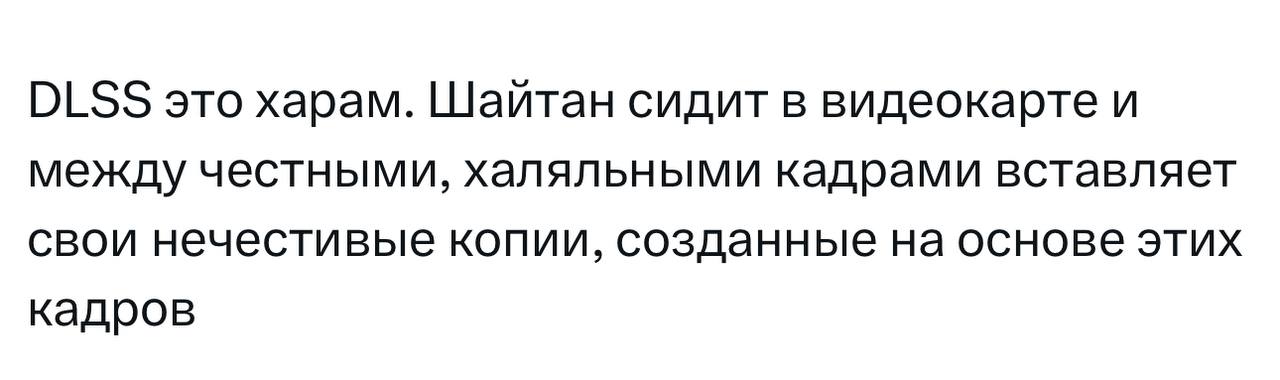 Купил я на свою голову эту новую карту, думал, вау, next gen. А это оказалась хуйня, которая без этих костылей нихуя не тянет! Её настоящая мощность – 60 фпс в новых играх на ультрах, а чтобы было 120, надо включать этот цифровой морфинг, этот обман зрения! И все вокруг такие: «НОРМАЛЬНО ЖЕ, ГЛАЗ НЕ ВИДИТ РАЗНИЦЫ».