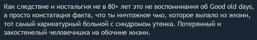 Как следствие и ностальгия не в 80+ лет это не воспоминания об Good old days, а просто констатация факта, что ты ничтожное чмо, которое выпало из жизни, тот самый карикатурный больной с синдромом утенка. Потерянный и закостенелый человечишка на обочине жизни.