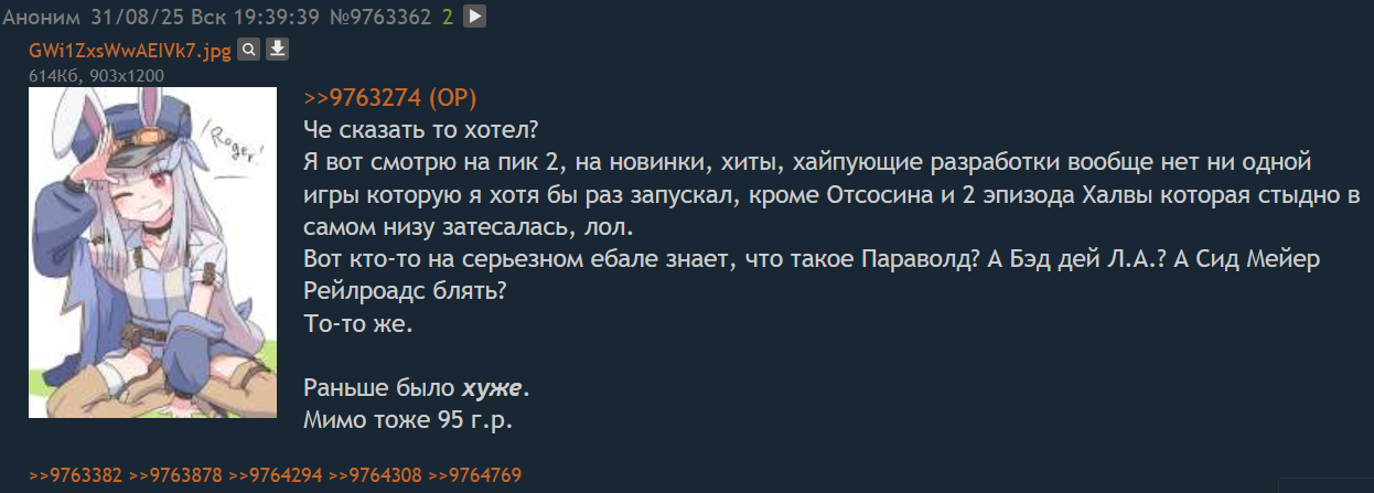 >>9763274 (OP) Че сказать то хотел? Я вот смотрю на пик 2, на новинки, хиты, хайпующие разработки вообще нет ни одной игры которую я хотя бы раз запускал, кроме Отсосина и 2 эпизода Халвы которая стыдно в самом низу затесалась, лол. Вот кто-то на серьезном ебале знает, что такое Параволд? А Бэд дей Л.А.? А Сид Мейер Рейлроадс блять? То-то же.