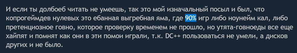 И если ты долбоеб читать не умеешь, так это мой изначальный посыл и был, что копрогеймдев нулевых это ебанная выгребная яма, где 90% игр либо ноунейм кал, либо претенциозное говно, которое проверку временем не прошло, но утята-говноеды все еще хайпят и помнят как они в эти помои играли, т.к. DC++ пользоваться не умели, а дисков других и не было.