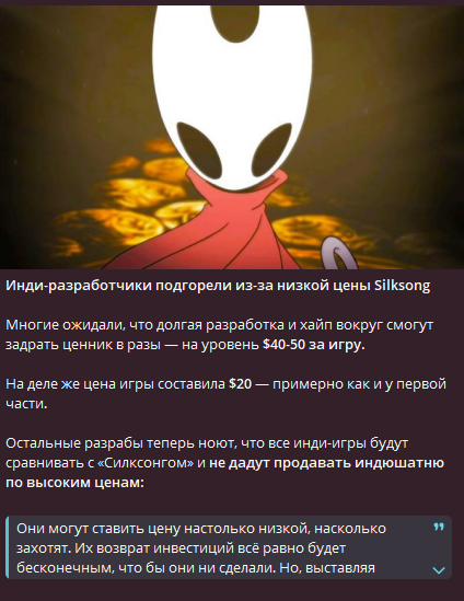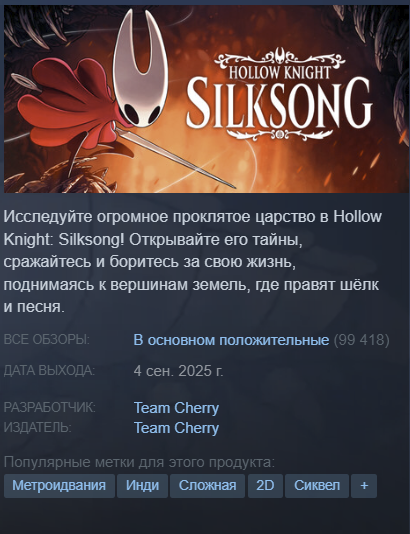 Silksong. Величайшее творение игровой индустрии, шедевр, созданный еще до того, как кто-то вообще в него поиграл. Годы ожидания, тысячи часов теорий от "экспертов" на Ютубе. Фанаты заранее канонизировали Team Cherry и воздвигли нерукотворный памятник игре, которая существовала только в их влажных фантазиях. Каждый пиксель арта превозносился как откровение, каждая нота саундтрека – как симфония богов. "Игра поколения", "убийца всего", "11/10 на кончиках пальцев"