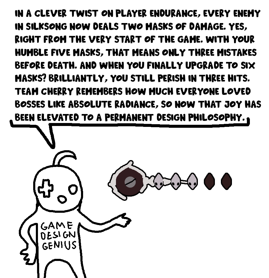 Я вам так скажу. Вся сложность игры множится на ноль реворком шелкового сердца. Сейчас оно даёт нахуй ненужный и совершенно смехотворный реген шелка. На максимальном уровне получаешь 3 полоски шелка плюс 1 с чармика, и того ты не спелл приминить, ни отхилиться не можешь, только летать на гарпуне. Надо сделать, чтобы прокачка шелкового сердца увеличивало количество шелка получаемого за удар. На нулевом 1 полоску, на первом 2 и т.п. вплоть до 5 под чармиком. На макс прокачке под чармиком можно спамить спеллами и хилиться бе проблем. Сделает ли игру слишком изичёвой? Возможно, надо смотреть.