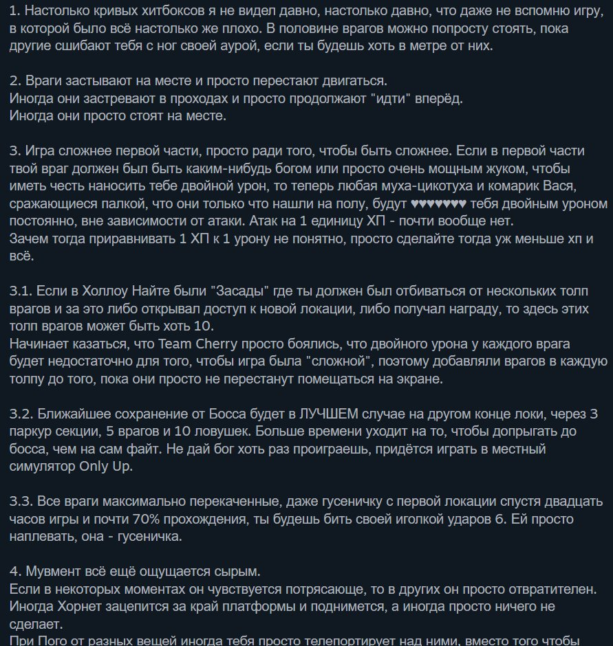 Игра стала еще быстрее чем первая часть. Почему бы не добавить паучье чутье, что бы когда Хорнет закрывают у нее была абилка на замедление времени. Все любят замедление времени, любая ААА игра имеет замедление времени. Понятно что задрочить игру можно до дыр и на скорость х2, но мы же говорим про обычных смертных, кто хочет кайфануть от игры, а не стиснув зубы заучивать мувсеты