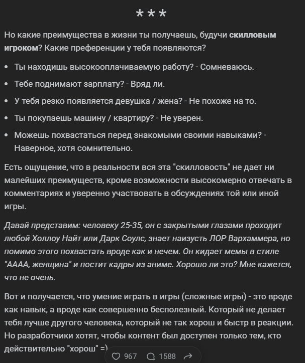 Вообще кажется что люди которые хейтят сложные игры на самом деле ценят сложность (или видимость сложности, или признание за то что прошли "сложную" игру) - и сгорают когда не вывозят. Челы которым реально похуй на сложность просто читы качают и кайфуют.