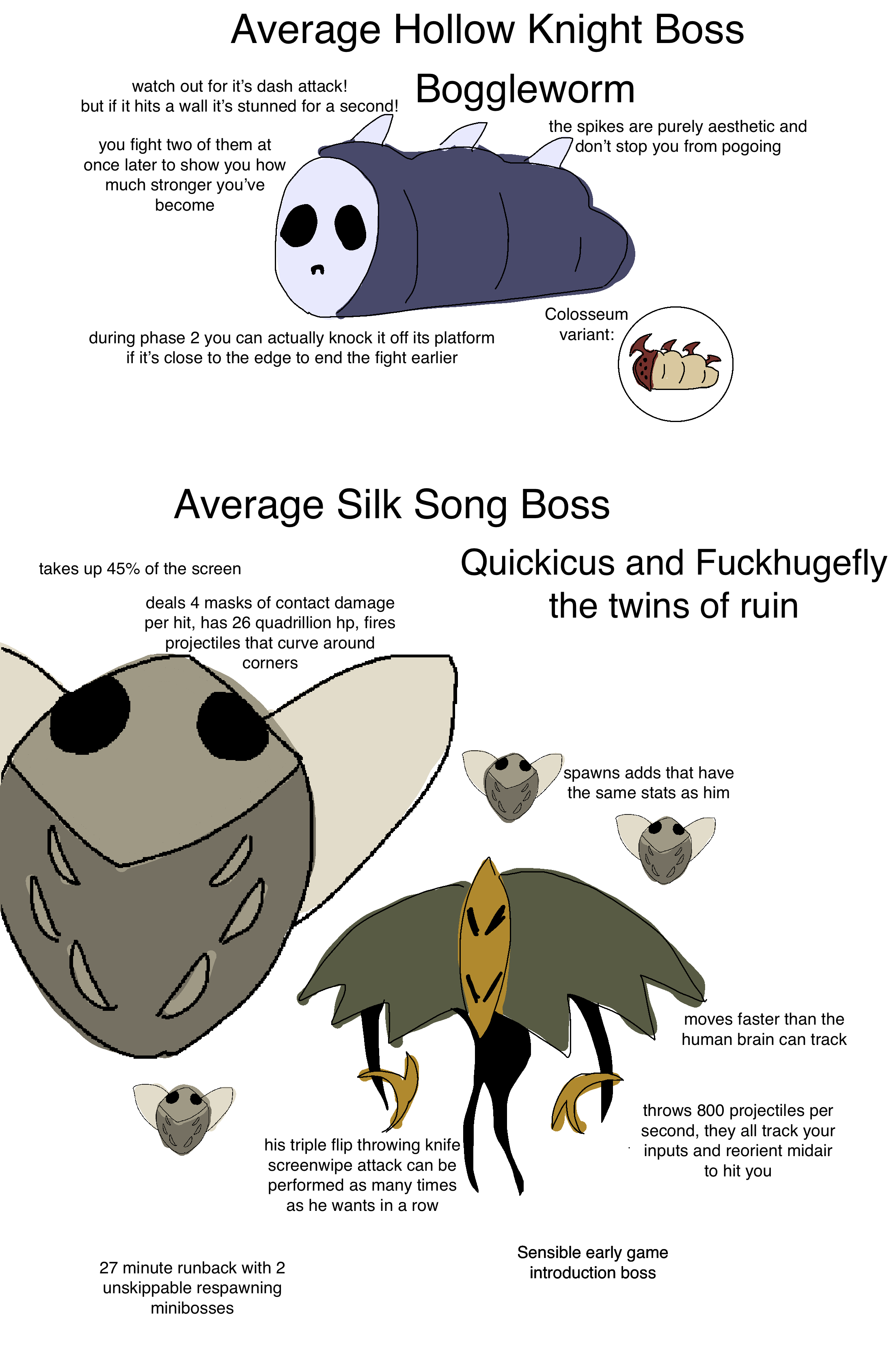 Hollow Knight: Метроидвания с элементами дарк соулса Silksong: Сосалик до мозга костей, бездумное копирование методички сосаликов которые всех ЗАЕБАЛИ, это будет последняя успешная игра в этом жанре. Силксонг это ламповая, возможно гениальная игра из которой долго удаляли душу переделывая её под популярный Элден Ринг
