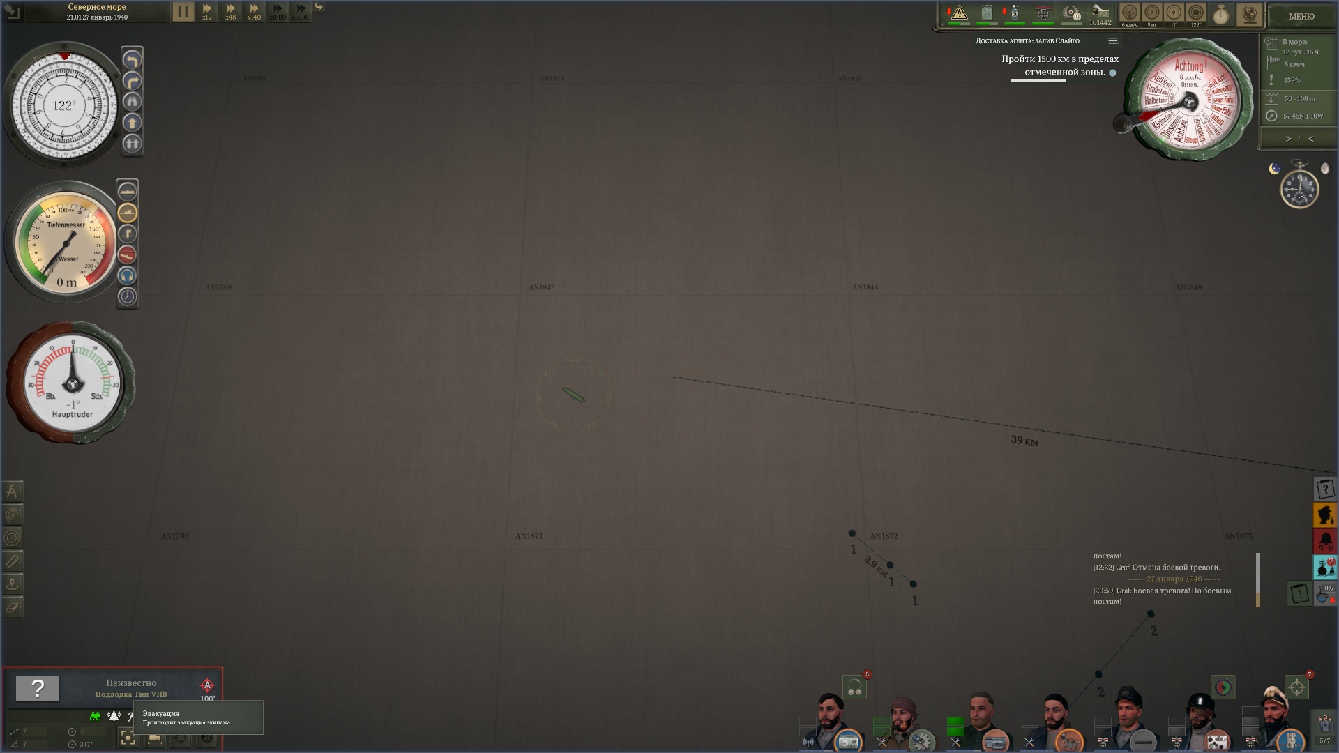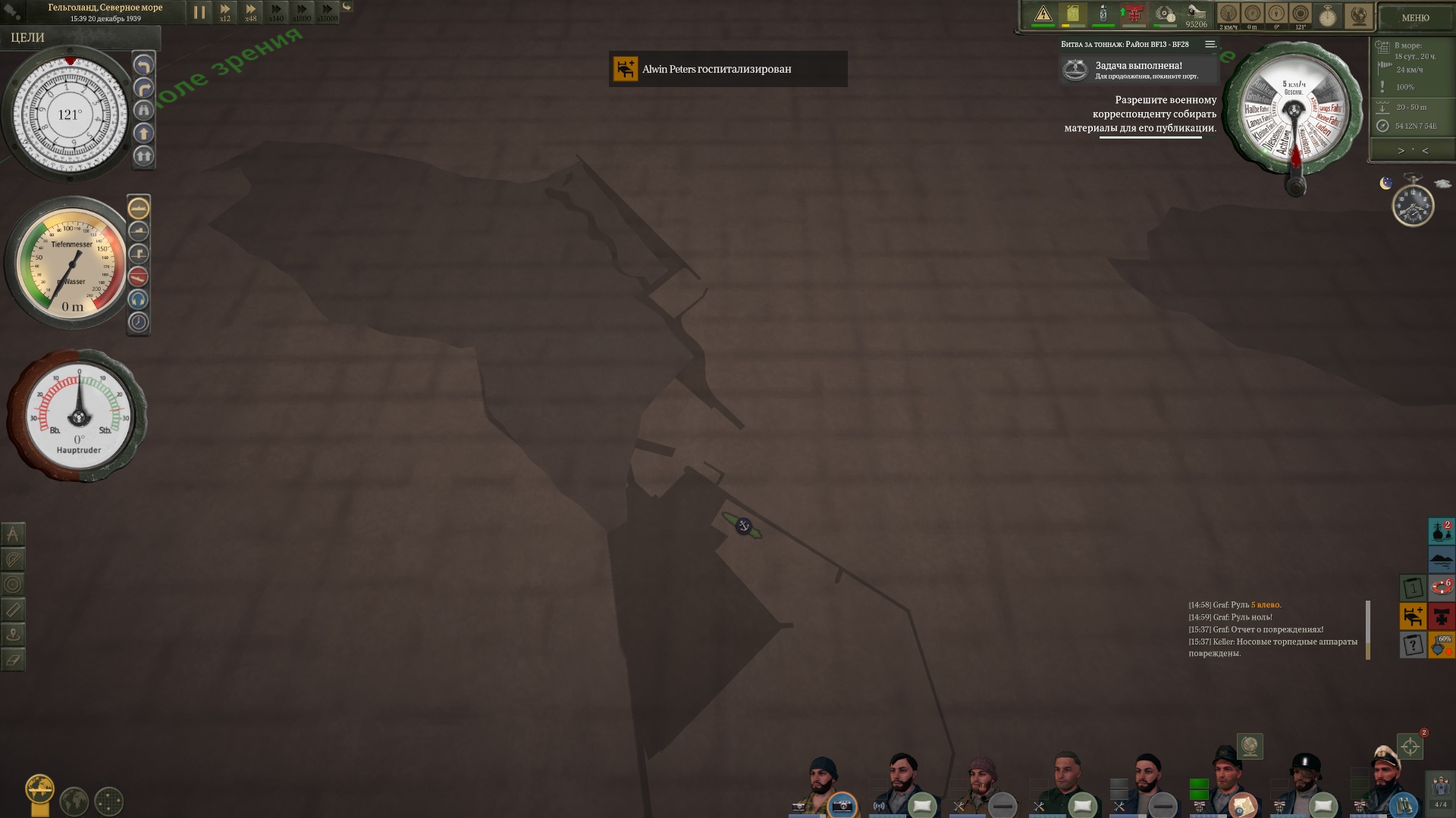 Капитан нахуярился и выпал из рубки, едва спасли. Тупо стоял там с задачей наблюдение, пока не вырубился, не выпал и не стал сползать с корпуса. Помню, как 20мм зениткой обмазывал грузовое судно, чтобы лишнюю торпеду не тратить, и там из окон иногда так же кто-то падал. Ускорение времени не вписывается в повороты. Постоянно выбрасывает то на мель, то на бортики причала, а торпеды возле корпуса лодки взрываются, если пускать с ускорением, как будто в стену невидимую вмазываются. Особенно с замороченным причалом Гильгалада плохо. И меня заебал военный корреспондент. 2 недели наверно в море был, все задачи выполнены, торпед нет, половина команды сошла с ума, у другой туберкулез, из жратвы только сушеный картофель тухлое. А ему всё мало материала для статьи. Он даже вопросы не задает, это какой-то баг, просто шкала еле полез. Но я хочу жирную репутацию за миссию. Больше журналюг не беру.